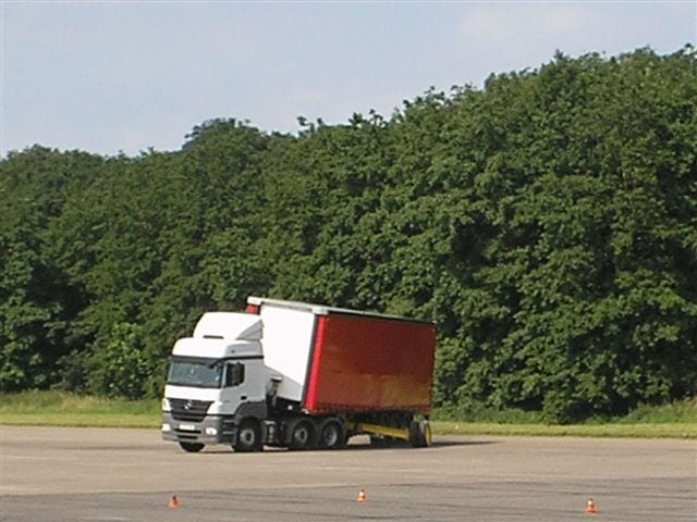 With a Dynamic test the trailer is loaded. The cargo must be evenly distributed the full length and a minimum of ½ the overall height of the trailer. Once loaded the trailer is driven around a test track at a constant speed incorporating numerous manoeuvres within each lap of the track. The trailer must complete a minimum of 3 consecutive laps of the test track.